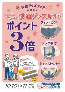店舗限定! 10月10日(金)~11月3日(月・祝)の期間中、パンツ・スカートの快適グッズをお取り付けで、[ママのリフォーム ポイントカードがポイント3倍!]になるキャンペーンを実施いたします。 お気に入りのパンツを快適に長くご使用いただける便利グッズたちになっております! まだ未体験の皆様、ぜひお試しいください〜♪