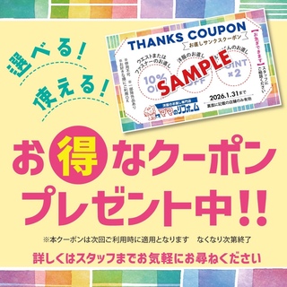 ご来店されたお客様に、2026年1月31日まで使えるお得なクーポンをプレゼント中!! 選べて使えるお得なクーポンとなっております。是非この機会にご利用ください。 ご来店お待ちしております♪
