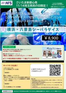 11月14日埼玉県民の日限定!!! さいたま新都心発「横浜・八景島シーパラダイス日帰りバスツアー」販売中です!! 埼玉県民の日特別企画としてかわいい動物たちとパシャリ「ふれあいフォト」の特典付き! この機会に是非ご検討くださいませ!