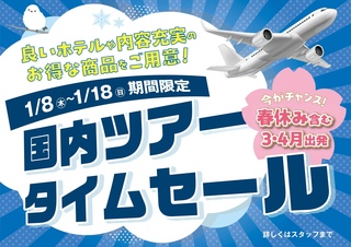 1月8日(木)~1月18日(日)まで限定! 国内ツアータイムセール開催中です!! 航空機利用国内ツアーはタイムセール商品がお得! ぜひこの機会にお問い合わせください! ※詳細は弊社HPまたはスタッフまでお問い合わせください。