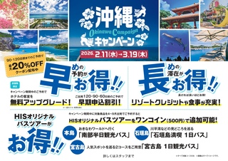 2月11日(水)~3月19日(木)の期間限定! 沖縄がお得に楽しめる!沖縄キャンペーン開催中です! 早割・連泊特典・特別価格などお得が盛り沢山☆☆ ぜひこの機会にお問い合わせください! ※詳細はスタッフまでお問い合わせください。
