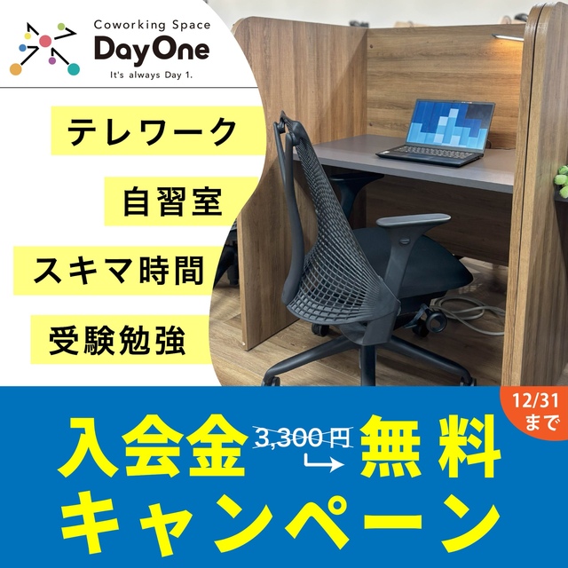 クーポン 掲載日:2025-11-01 【入会金無料】この冬、はじめの一歩キャンペーン! 期間2025年11月1日~2025年12月31日 注意事項入会金3,300円が今なら無料です!! 印刷 この画面をショップの方へ見せてください。 0 tweetする Facebookでシェアする LINEで送る スキマ時間 自習室 テレワーク コワーキングスペースDayOne(デイワン)のショップページへ戻る