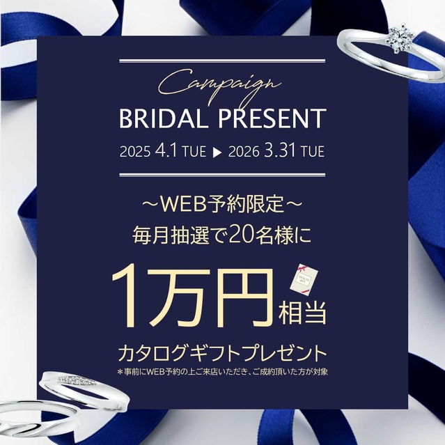 結婚指輪・婚約指輪をお探しの方に朗報♪ ブライダルWEB予約キャンペーンを実施中! WEB予約の上、店舗にご来店いただき、ご成約いただいた方の中から 毎月抽選で20名様にカタログギフト1万円相当をプレゼント! さらに、WEB予約ご来店特典として当社割引券3千円分をプレゼント! プロポーズを予定している方、ご結婚を予定している方、 ちょっとでも気になったらぜひWEB予約の上店頭にてご覧ください! ご来店心よりお待ちしております。 ■開催期間 2025 年4月1日(火)~2026年3月31日(火) ■キャンペーン参加方法 下記URLよりご予約の上、店舗にご来店ください。 ご成約があった時点で自動エントリーされます。 ■当選者の発表 当選者の発表は該当の店舗よりご連絡いたします。 カタログギフトは店舗にてお渡しいたします。 ■ご予約は下記の「くわしくはこちら」から ※ご来店いただける店舗をお選びください。