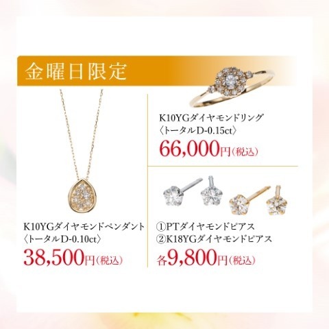 朝晩とても寒くなりましたが、皆様体調はいかがでしょうか? 当店ではクリスマスツリーを出したり、お店の中がクリスマスムードになっております。 クリスマスや1年間のご自分へのご褒美などにもぴったりな かわいいゴールドカラーのネックレスやピアスが新作として登場いたしました! K10YGダイヤモンド付きネックレス¥33,000(税込) 新作のネックレス、とってもかわいいのでぜひ店頭まで見にいらしてくださいませ。